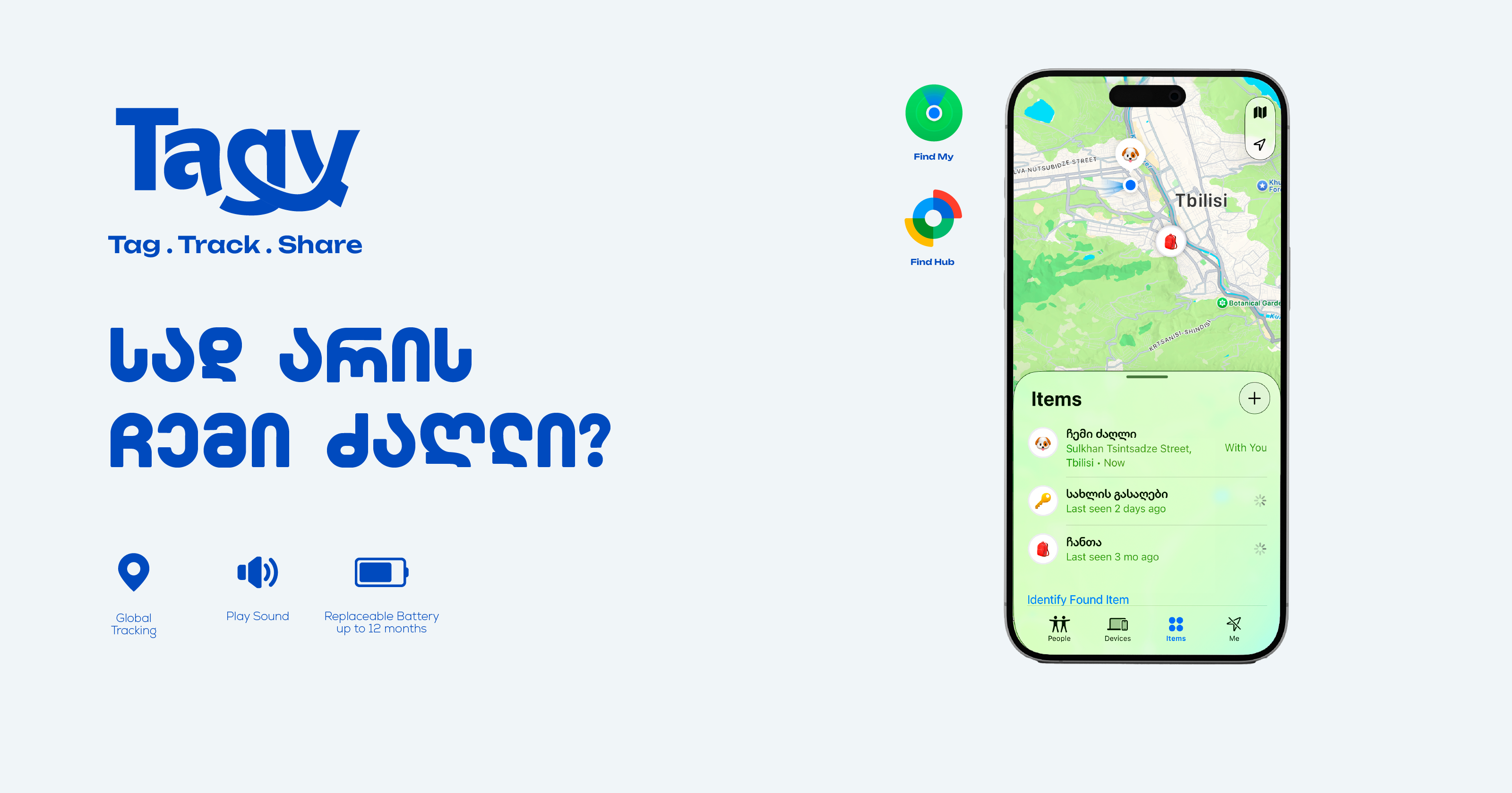 უსაფრთხოება ჩვენი პრიორიტეტია. „თაგი“ სერტიფიცირებულია (MFi & Google) და აღჭურვილია უსაფრთხოების ფუნქციით, რომელიც მომხმარებელს მაშინვე გააფრთხილებს, თუ სისტემა დააფიქსირებს, რომ უცხო ტრეკერი მასთან ერთად გადაადგილდება. ეს გამორიცხავს მოწყობილობის გამოყენებას არაკეთილსინდისიერი მიზნებისთვის. MFi (Made for iPhone/iPad) სერტიფიკაცია Apple-ისგან და Google-ის Find My Device სერტიფიკაცია ნიშნავს, რომ Tagy -მ გაიარა მკაცრი ტესტირება თავსებადობის, უსაფრთხოებისა და ხარისხისთვის - ის სრულად ინტეგრირდება ოფიციალურ ქსელებში. პრაქტიკაში ეს უზრუნველყოფს სტაბილურ მუშაობას, განახლებებს და თავსებადობას ახალ მოწყობილობებთან. მონაცემთა დაცვა უმაღლეს დონეზეა: ლოკაცია ანონიმურად იგზავნება (დაშიფრულია end-to-end), Apple/Google არ იზიარებენ პერსონალურ მონაცემებს, და არსებობს დაცვა არასასურველი თრექინგისგან (უცხო ადამიანი ვერ გამოიყენებს თქვენს Tagy-ს თქვენს წინააღმდეგ). მომხმარებლის კონფიდენციალურობა ჩვენთვის პრიორიტეტია.