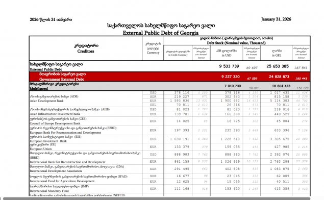 იანვრის მონაცემებითვე, მრავალმხრივი კრედიტორების წინაშე დავალიანება 7 010 730 ათასი დოლარია, ანუ 18 864 473 ათასი ლარი.