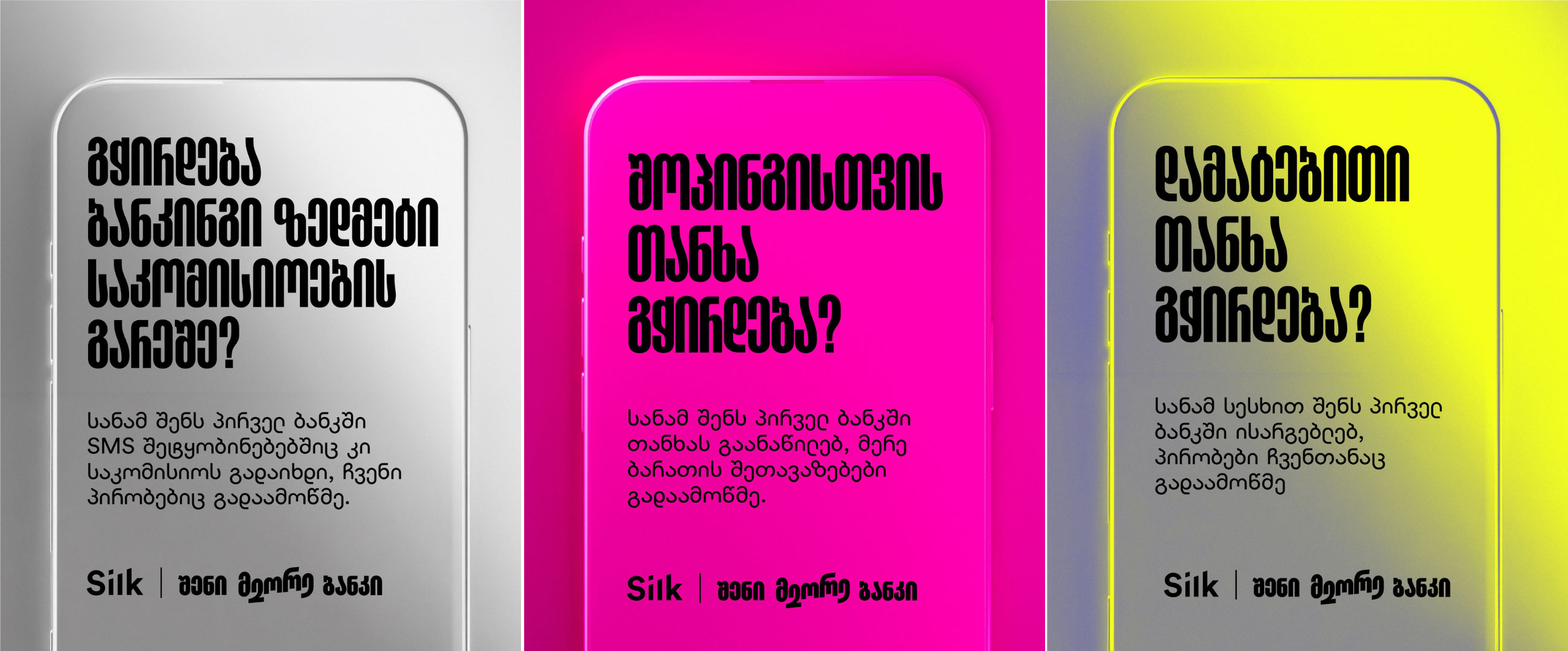 ამ მოცემულობას იდეალურად უპირისპირდება სილქ ბანკის პროდუქტები, სერვისები და ზოგადად, ბრენდის ხასიათი. სილქი რაციონალური და მოქნილი ბანკია, ხელსაყრელი და ალტერნატიული პროდუქტებით, რომლებიც მარტივად შეგიძლია, შენი პირველი ბანკის პროდუქტებთან ერთად, შემავსებლად გამოიყენო; ან, თუნდაც, შენი პირველი ბანკის პირობებს შეადარო, გადაწყვეტილების მისაღებად მეტი დამოუკიდებლობა გქონდეს და შედეგიც უფრო ხელსაყრელი მიიღო.