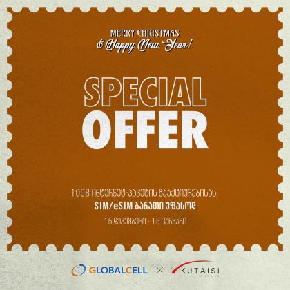 გლობალ სელ - GLOBALCELL-ის ოფისებში, მათ შორის, ქუთაისის საერთაშორისო აეროპორტში მდებარე ფილიალში, მომხმარებლებს დახვდებათ 100%-იანი ფასდაკლება საერთაშორისო SIM, ისე eSIM ბარათებზე - აბონენტის მიერ 10GB-იანი ინტერნეტ პაკეტის გააქტიურებისას.