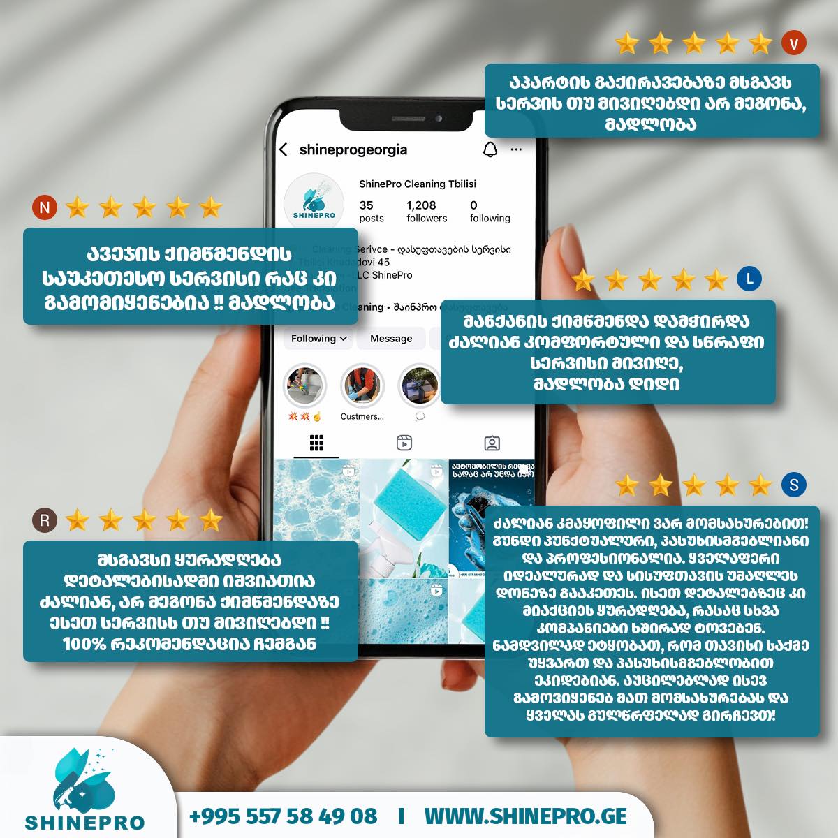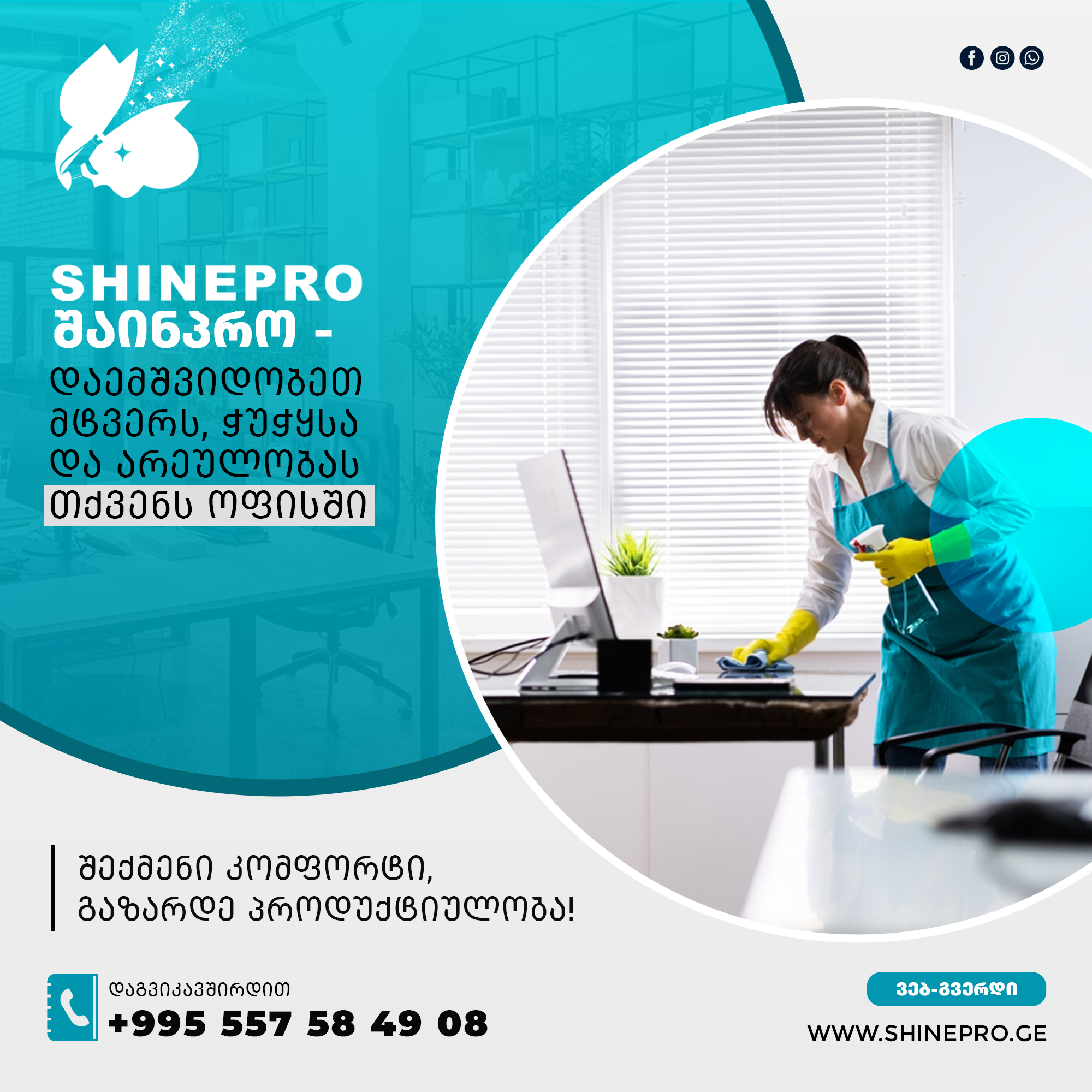კომპანია „შაინპრო“ მომხმარებელს სთავაზობს სრულ დასუფთავების მომსახურებას. ბაზარზე 2024 წლის მარტიდან გამოვჩნდით და ჩვენი მიზანი იყო გვქონოდა როგორც B2B მიმართულებით მომსახურება, ასევე B2C. გვინდა, რომ შევქმანთ კომფორტული გარემო ჩვენი მომხმარებლისა და პარტნიორებისთვის, სადაც ხარისხი, კმაყოფილება და ნდობა გადის სწორ კომუნიკაციასა და პასუხისმგებლობის ჯეროვნად შესრულებაზე.