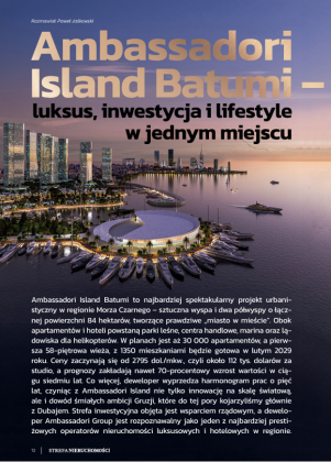 პროექტ „ამბასადორი აილენდ ბათუმის” შესახებ მომზადებულ ვრცელ სტატიაში თავმოყრილია პოლონელი პარტნიორების შეფასებებიც. „ამბასადორი აილენდ ბათუმი - შავი ზღვის პირველი ხელოვნური კუნძული ის საინვესტიციო შესაძლებლობაა, რომელიც თავისი მასშტაბით შთამბეჭდავია და აქვს შანსი შეცვალოს საქართველოს იერსახე“ - ამ სათაურით წარმოგიდგენთ ჟურნალი ინტერვიუებს მარიუშ გაჟევსკისთან, ბარტოშ შუბასთან, გოჩა კამკიასთან და კლაუდია ბარტოსიევიჩთან. Exclusive Poland-ის ბიზნესის განვითარების მმართველი მენეჯერი მარიუშ გაჟევსკი აცხადებს, რომ „ამბასადორი აილენდ ბათუმი” ხარისხის, ინოვაციისა და ნდობის ახალი სიმბოლოა საერთაშორისო საინვესტიციო ბაზარზე.