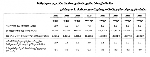 2026-2029 წლებში ქვეყნის ეკონომიკა მოსალოდნელია საშუალოდ 5.2 პროცენტით გაიზარდოს. 2029 წლისთვის ნომინალური მთლიანი შიდა პროდუქტი 145.5 მლრდ ლარამდე გაიზრდება, ხოლო მშპ ერთ სულ მოსახლეზე 2024 წელთან შედარებით 14.2 ათასი ლარით (5.3 ათასი აშშ დოლარით) მოიმატებს და 39 319.0 ლარს (14 508.9 აშშ დოლარი) გაუტოლდება.