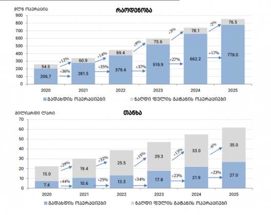 „წინა წლის შესაბამის მაჩვენებლებთან შედარებით ოპერაციების რაოდენობა გაიზარდა 15%-ით (თანხობრივად 13%-ით)“, - განმარტავენ სებ-ში.