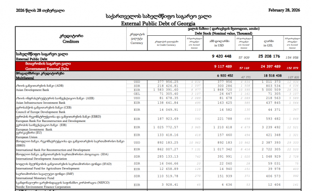 თებერვლის მონაცემებითვე, მრავალმხრივი კრედიტორების წინაშე დავალიანება 6 920 452 ათასი დოლარია, ანუ 18 518 438 ათასი ლარი.