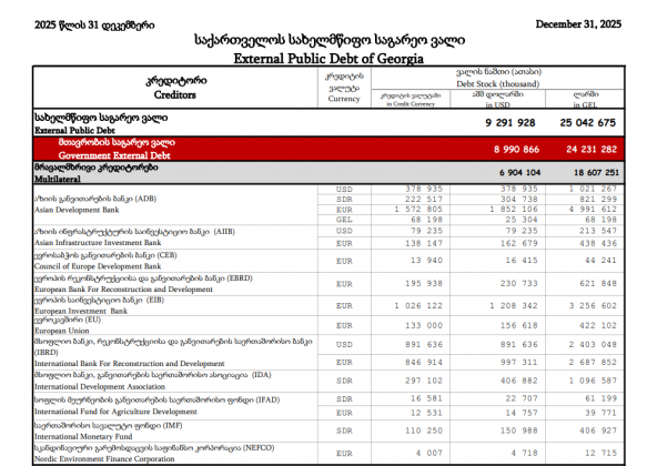 დეკემბრის მონაცემებითვე, მრავალმხრივი კრედიტორების წინაშე დავალიანება 6 904 104 ათასი დოლარია, ანუ 18 607 251 ათასი ლარი.